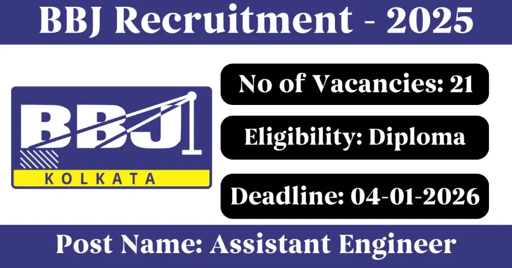 BBJ Bharti 2026 से जुड़ी बड़ी अपडेट सामने आ चुकी है। Braithwaite Burn & Jessop Construction Company Limited (BBJ) ने Assistant Engineer और Assistant Officer (HRM) पदों पर भर्ती के लिए आधिकारिक नोटिफिकेशन जारी कर दिया है। यह भर्ती BBJ Recruitment Vacancy 2025 के अंतर्गत निकाली गई है, जिसमें कुल 21 पदों पर नियुक्ति की जाएगी। अगर आप इंजीनियरिंग या HR फील्ड से जुड़े हैं और सरकारी कंपनी में नौकरी की तलाश कर रहे हैं, तो BBJ Vacancy 2026 आपके लिए एक अच्छा अवसर बन सकती है।