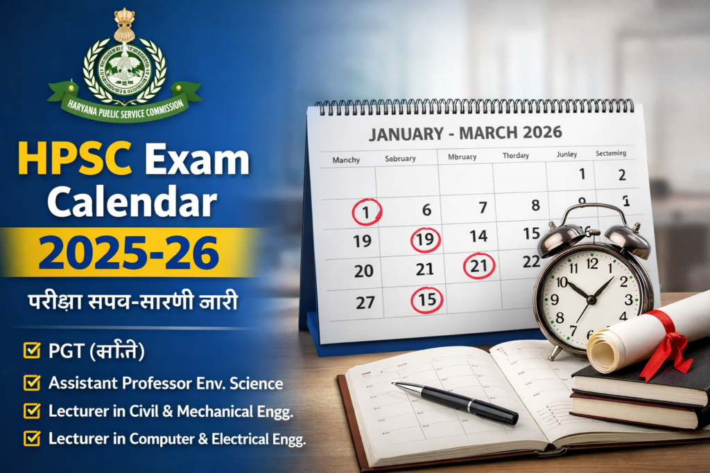 HPSC Exam Calendar 2025-26 Out की आधिकारिक जानकारी अब सामने आ चुकी है। हरियाणा लोक सेवा आयोग यानी Haryana Public Service Commission (HPSC) ने 17 दिसंबर को HPSC Exam Calendar 2025-26 Released को लेकर नोटिफिकेशन जारी कर दिया है। इस परीक्षा कैलेंडर में उन सभी भर्तियों की परीक्षाओं की तारीखें शामिल हैं, जिनके विज्ञापन वर्ष 2024-25 के दौरान जारी किए गए थे।
