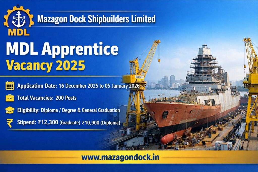 Mazagon Dock Shipbuilders MDL Apprentice Vacancy 2025 को लेकर आधिकारिक नोटिफिकेशन जारी कर दिया गया है। Mazagon Dock Shipbuilders Limited, जिसे आमतौर पर MDL कहा जाता है, ने 15 दिसंबर 2025 को MDL Apprentice Bharti 2025 की घोषणा की है। इस भर्ती के अंतर्गत कुल 200 अप्रेंटिस पदों को भरा जाएगा। आवेदन प्रक्रिया 16 दिसंबर 2025 से शुरू हो चुकी है और इच्छुक उम्मीदवार 05 जनवरी 2026 तक ऑनलाइन आवेदन कर सकते हैं।