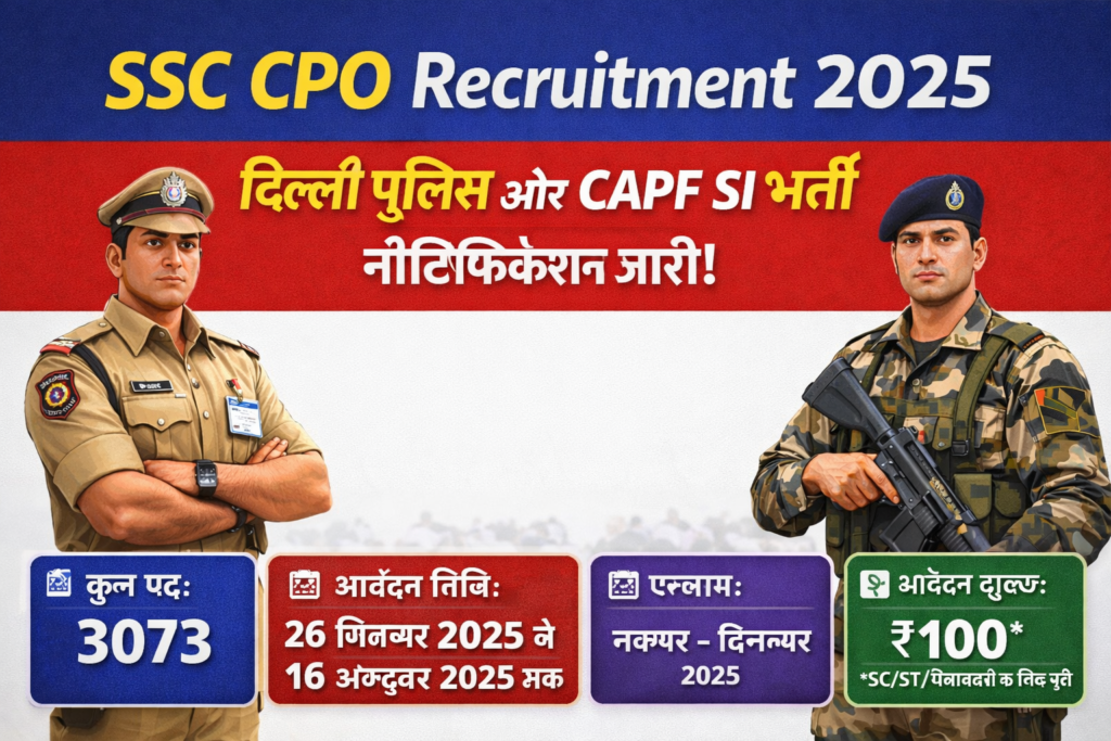 अगर आप सरकारी नौकरी की तैयारी कर रहे हैं और पुलिस या अर्धसैनिक बलों में सब-इंस्पेक्टर बनने का सपना देखते हैं, तो SSC CPO Recruitment 2025 आपके लिए एक अहम मौका लेकर आया है। Staff Selection Commission की तरफ से SSC CPO Sub Inspector Recruitment 2025 Notification आधिकारिक रूप से जारी कर दी गई है। यह भर्ती Delhi Police और विभिन्न CAPFs में Sub-Inspector पदों के लिए निकाली गई है।
